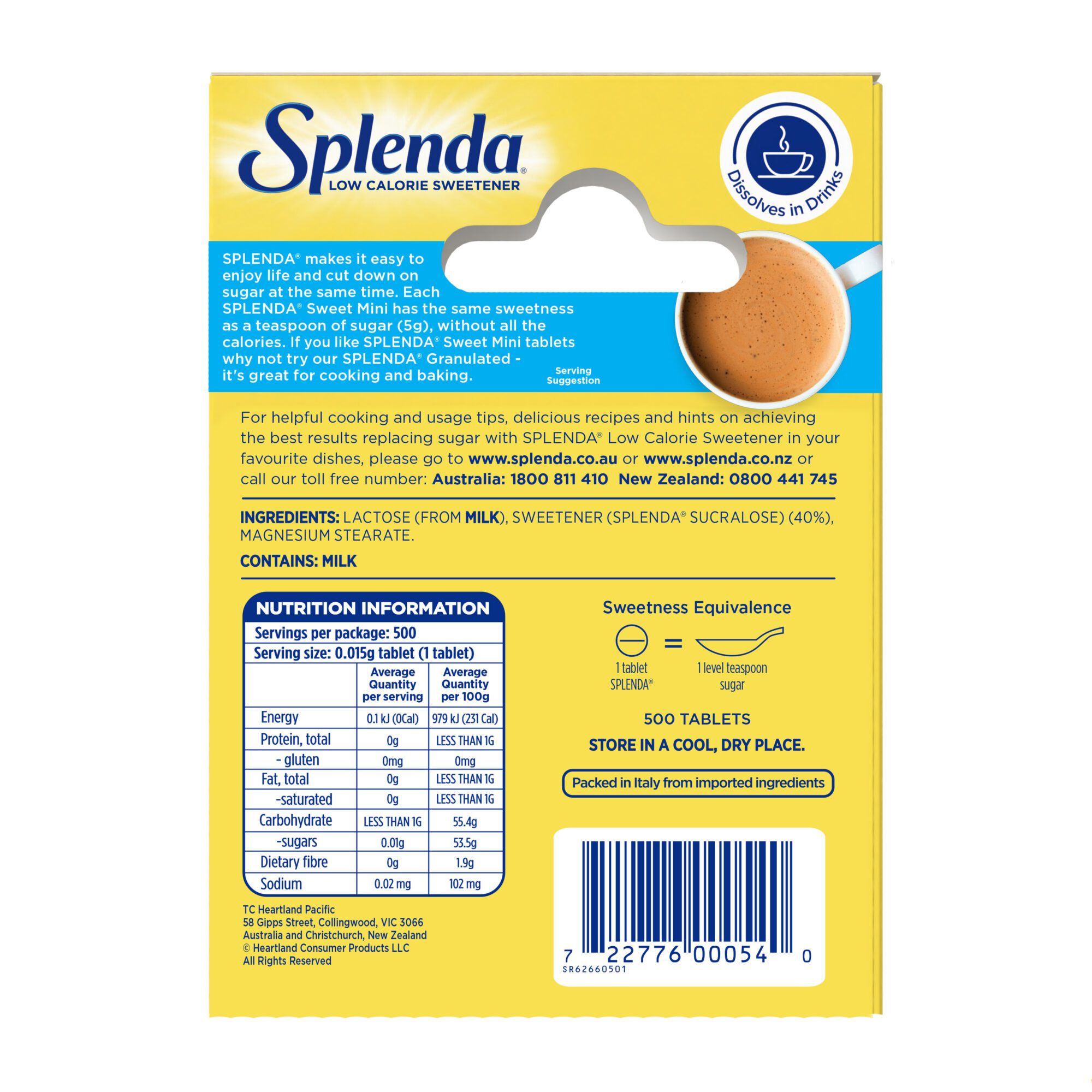 Splenda Tablets are ideal for sweetening beverages including tea and coffee. One Splenda Tablet has the equivalent sweetness to one teaspoon of sugar. Each Splenda Tablet has 0.2 calories or 0.8kJ. Each Splenda Tablet has 98% less calories than one teaspoon of sugar. There are no calories in sucralose. The calories in each Splenda® tablet come from the small amount of lactose in the tablet which is added to give each tablet necessary bulk. Sweeten on the go with Splenda Tablets.